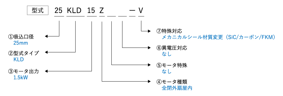 ①口径 ②型式タイプ ③モータ出力 ④モータ種類 ⑤モータ特殊 ⑥異電圧対応 ハイフン ⑦特殊対応