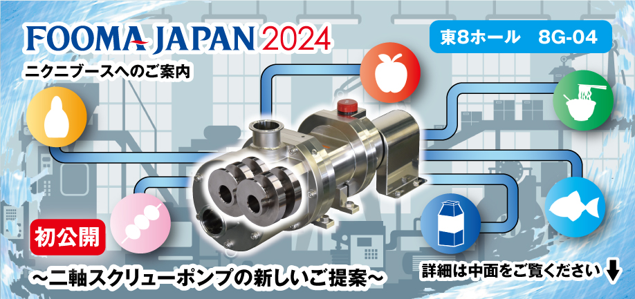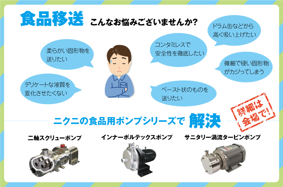 今回の展示では、あらゆる食品用途で活躍が期待できる二軸スクリューポンプをメインに、
