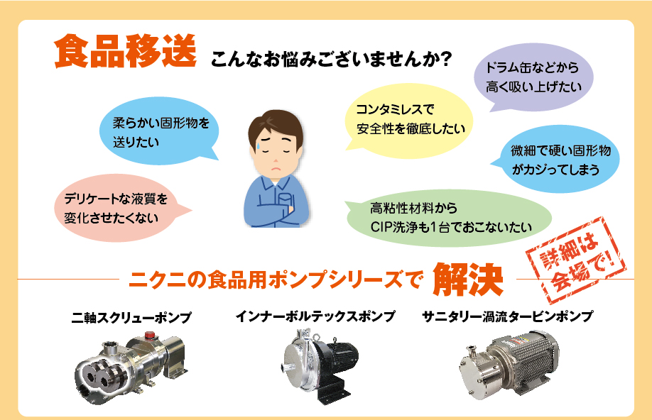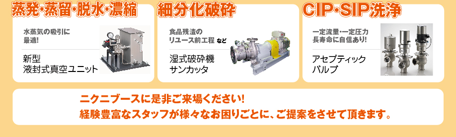 二軸スクリューポンプをメインに、真空ポンプ、アセプティックバルブ、インナーボルテックスポンプ、サニタリー渦流タービンポンプ、湿式破砕機などなど