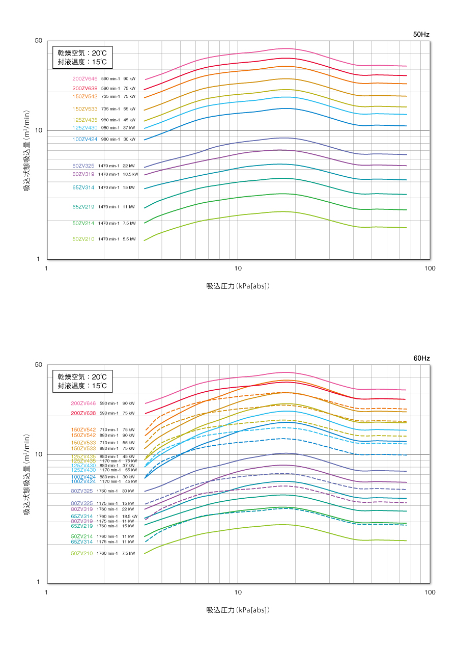 カタログの真空ポンプ性能表をご参照ください。なお、補給水量が過多の場合、モータの過負荷につながる場合があります。