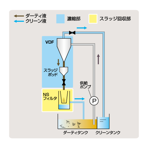 - 高性能サイクロンフィルタVDFによりアルミ(比重2.7)20?スラッジを90%除去。クーラント液の清浄度を維持し加工精度を向上させます。