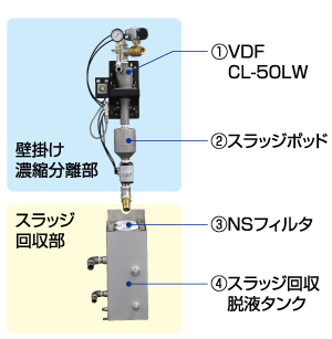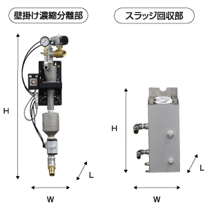 「壁掛け濃縮分離部」と「スラッジ回収部」を分割する事で設置の取り回しが自在。