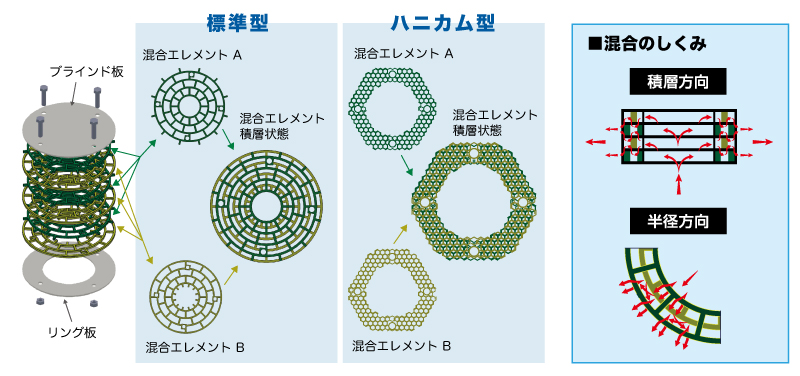 2 種類の異なる形状の「混合エレメントA・B」を交互に重ね、ブラインド板およびリング板で