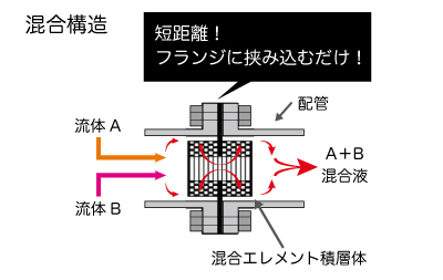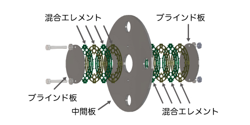 積層混合エレメントにより無数に分流と合流を繰り返す複雑な流路を形成し、効率の良い高い混合能力を発揮します。