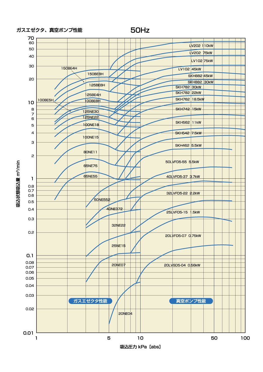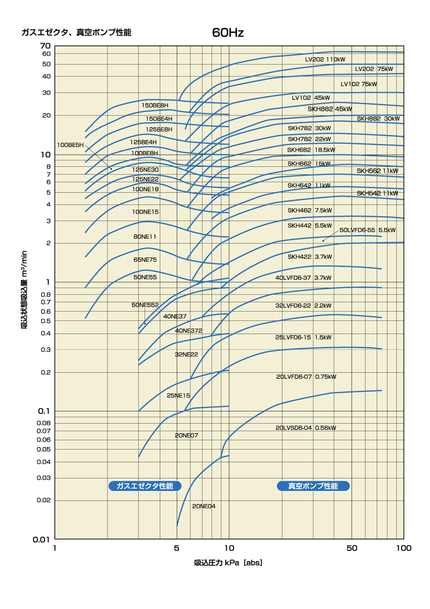 カタログの真空ポンプ性能表をご参照ください。なお、補給水量が過多の場合、モータの過負荷につながる場合があります。