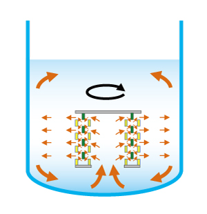 撹拌子RiSは、多孔板状の混合エレメントの積層体を、棒状撹拌子を組み込んだ台座の上にボルトで取り付けて構成されています。通常の撹拌子と同様にビーカー等の容器内に入れてマグネチックスターラー上に設置して撹拌します。 MSE撹拌子を容器内で回転させると、積層体内部に保持されていた流体は遠心力により外周部に吐出され、撹拌子中央の中空部からは流体が吸い込まれます。撹拌子に吸い込まれた流体は積層体内部を流れる際に、積層体内部の複雑な流路を流れる際に、分割・合流、せん断等の作用により効率的に混合されます。