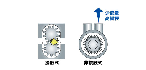 特徴は「少流量・高揚程」「圧力変化による流動変動が少ない」「低粘度の液体も移送可能」なことです。