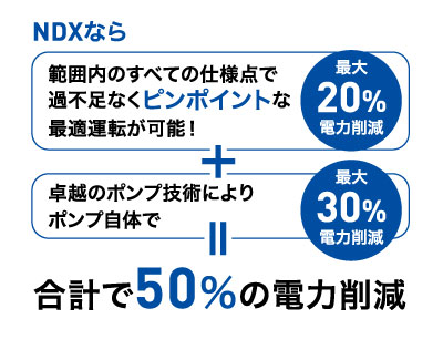 ・NDX型はポンプ自体で▲30%、さらに可変速制御で▲20%、合計▲50%の電力消費を実現