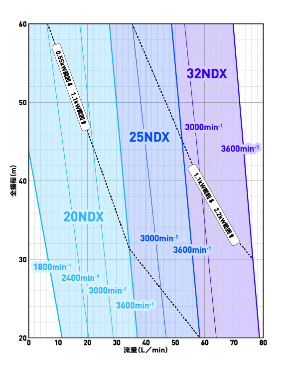 モータ軸動力・ポンプの耐圧・温度上昇の3つの条件により最少流量は決まります。各製品ごとの予想曲線をご参照頂き、詳しくは最寄りの弊社営業所へお問い合わせください。
