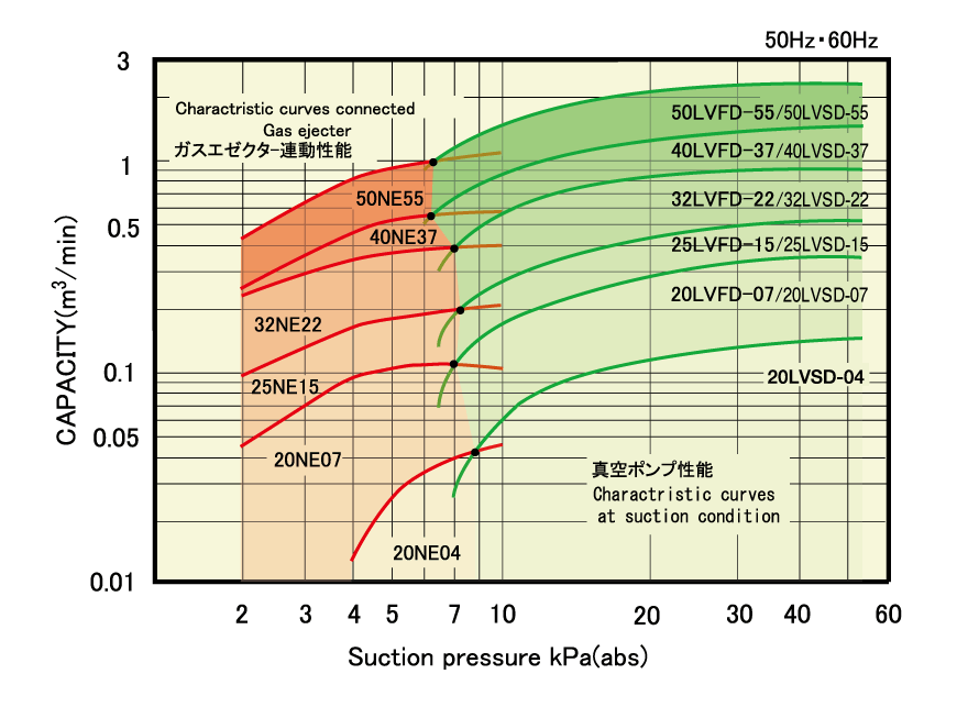 カタログの真空ポンプ性能表をご参照ください。なお、補給水量が過多の場合、モータの過負荷につながる場合があります。