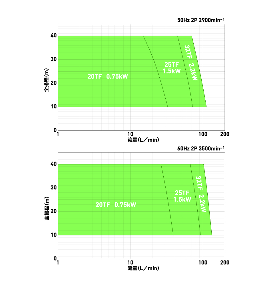 X軸が流量、Y軸が全揚程となります。流量が少ないほど全揚程は高くなり、流量が多いほど全揚程は低くなります。また、モータ軸動力は少流量になるにつれて大きくなりますので使える範囲に限界があります。要求仕様をポインティングし、ご希望の仕様を満たすかご確認ください。