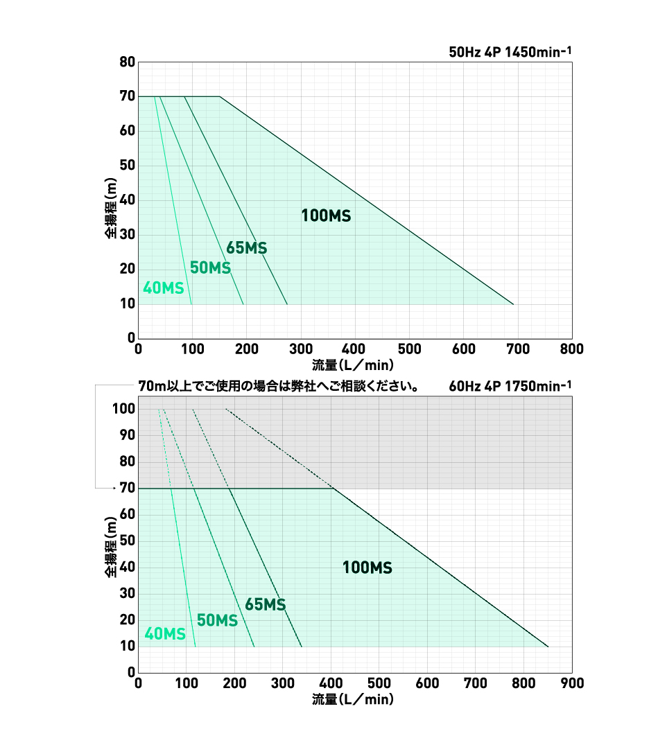 モータ軸動力・ポンプの耐圧・温度上昇の3つの条件により最少流量は決まります。各製品ごとの予想曲線をご参照頂き、詳しくは最寄りの弊社営業所へお問い合わせください。