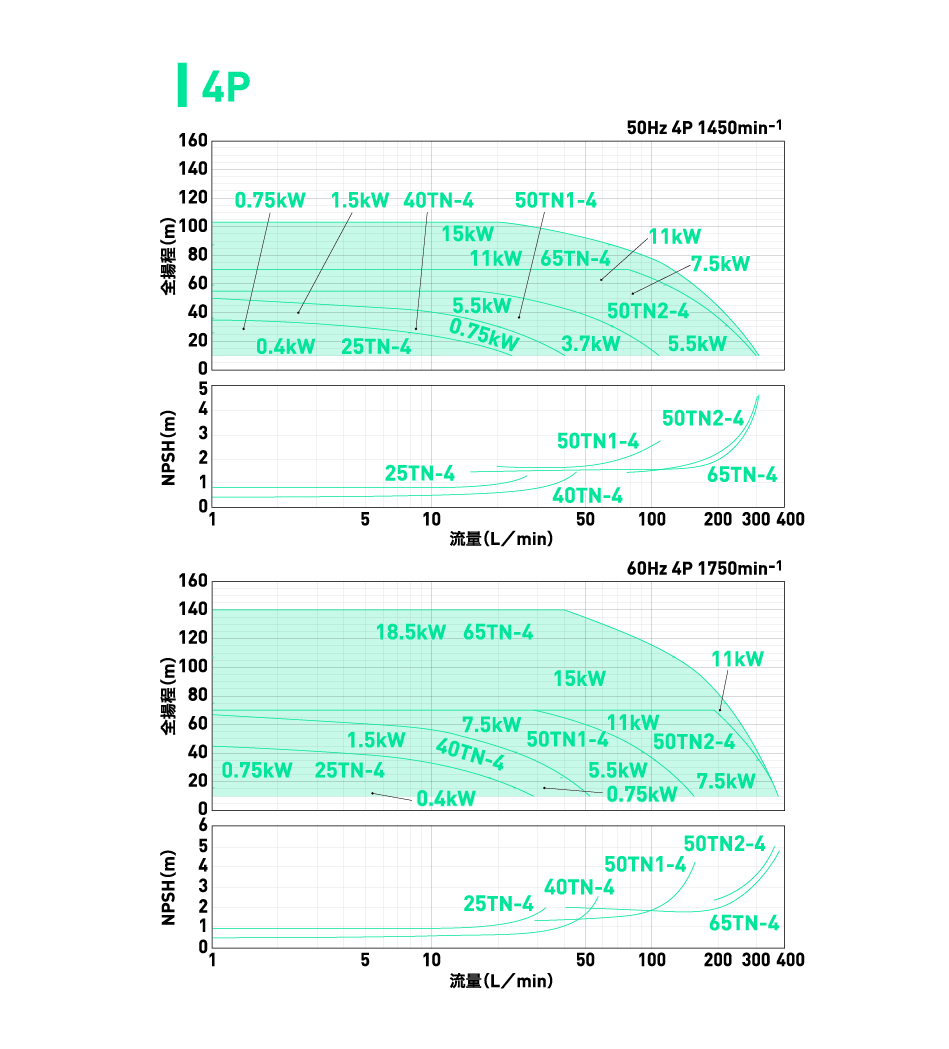 モータ軸動力・ポンプの耐圧・温度上昇の3つの条件により最少流量は決まります。各製品ごとの予想曲線をご参照頂き、詳しくは最寄りの弊社営業所へお問い合わせください。