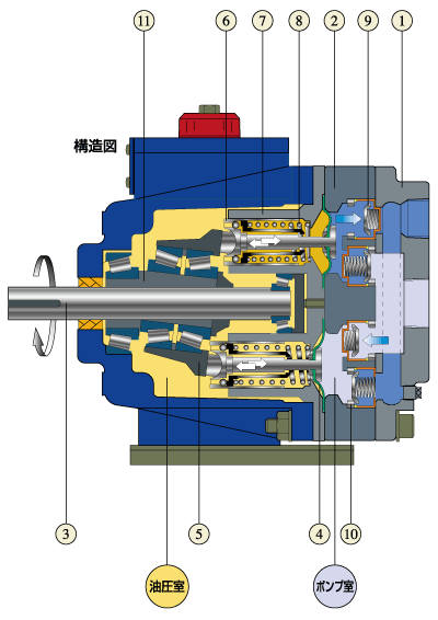 モータの回転力は潤滑油に満たされた油圧室で効果的に圧カエネルギーに変換されます。低圧から高圧(~7MPa)まで、85%の高効率が得られ消費電力を低減します。