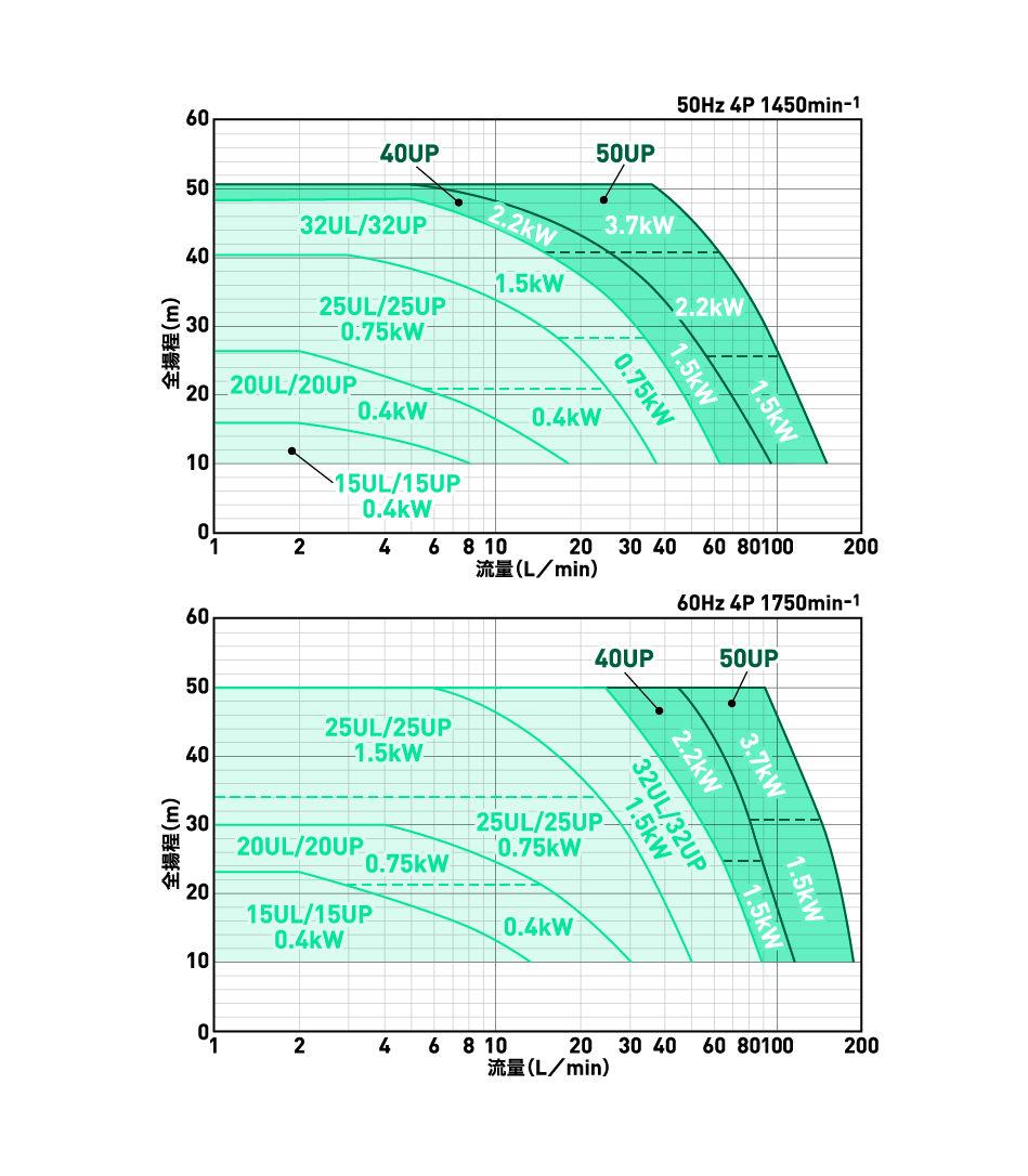 X軸が流量、Y軸が全揚程となります。流量が少ないほど全揚程は高くなり、流量が多いほど全揚程は低くなります。また、モータ軸動力は少流量になるにつれて大きくなりますので使える範囲に限界があります。要求仕様をポインティングし、ご希望の仕様を満たすかご確認ください。