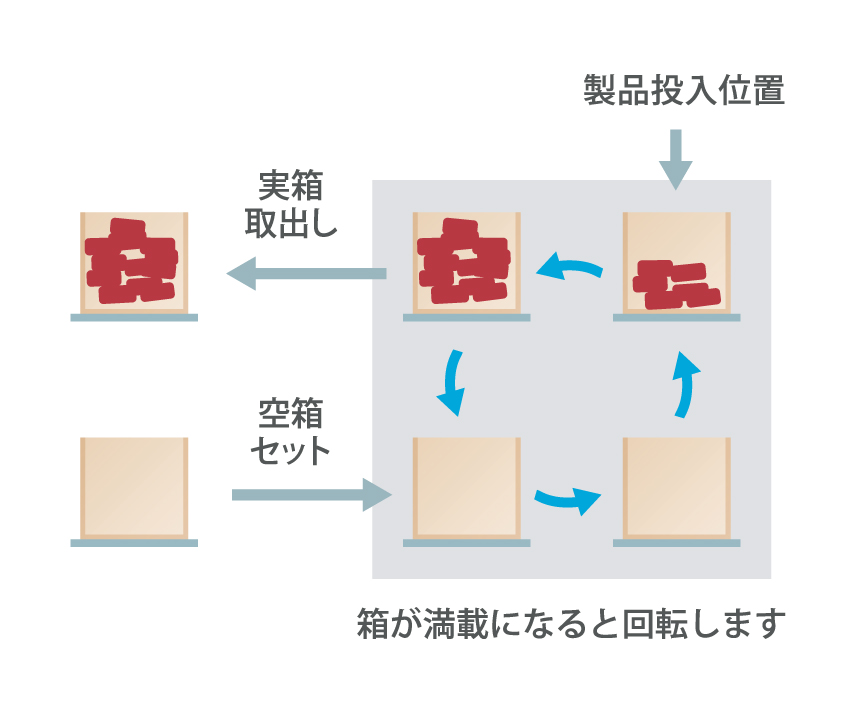 ・製品投入し、満載時に回転します※タイマー・ショット数確認センサ・外部信号から選択