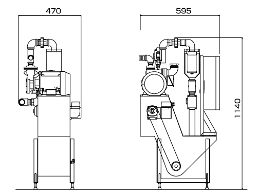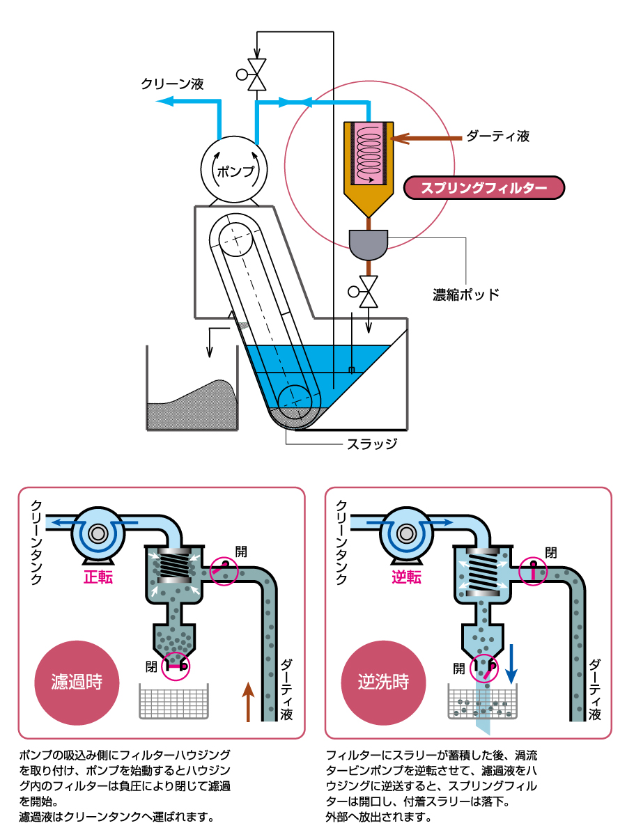 - タイマーもしくはスプリングフィルタ表層の固形物の堆積により管路抵抗圧の上昇を感知して、液吸引ポンプからは正転から逆転に移り、捕獲された固形物は瞬時にフィルタハウジング外へ排出されます。