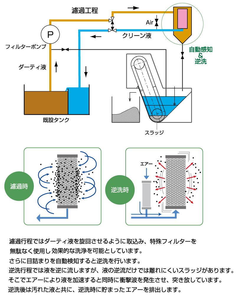 - 逆洗式特殊フィルタの目詰まりを検知して全自動でフィルタを洗浄しフィルタを再生します。その際に出た逆洗ダーティー液は沈殿層で沈殿分離された後にGUCで固形物のみをタンク外へ排出します。
