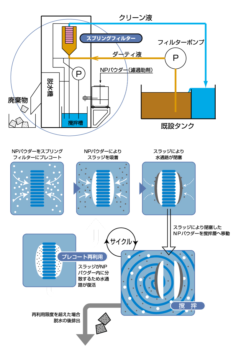 2. CPパウダーをスプリングフィルタに繰返し付着させて濾材として使用し、最終的に濾過能力が無くなったモノをケーキ状に脱水して排出します。従ってカートリッジフィルタ等の廃棄物を大幅に減らすだけでなく、フィルタの購入費、交換作業、タンク清掃などの人件費を含めたランニングコストを大幅に削減します。