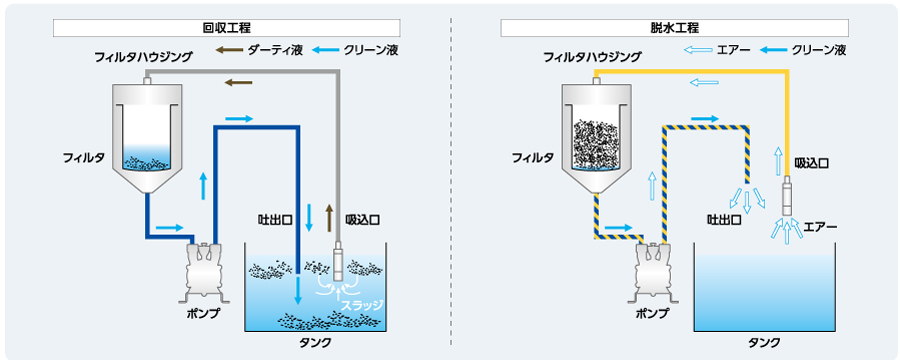 ポンプで気体を吸わせて固形物をしっかり脱水。バグフィルタごと取り出せ、汚さず残さず回収できる!標準仕様