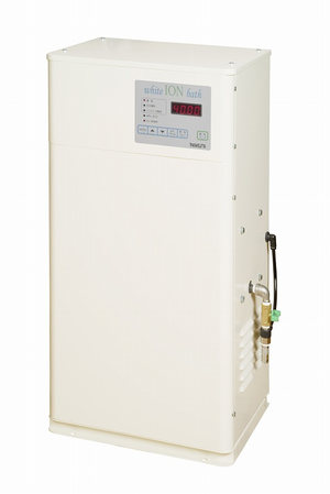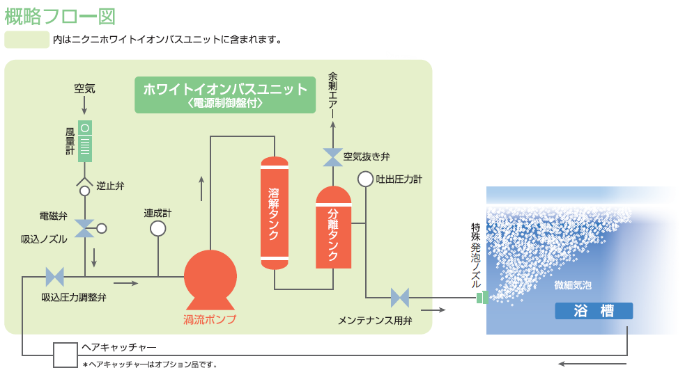ホワイトイオンバスはニクニ主力製品である「渦流タービンポンプ」の基本技術を活用し、マイクロサイズの小さな気泡を発生させることで、湯船を乳白色に変化させる装置です。ホワイトイオンバスの装置全体を構成しているのは以下の3つの製品だけです。